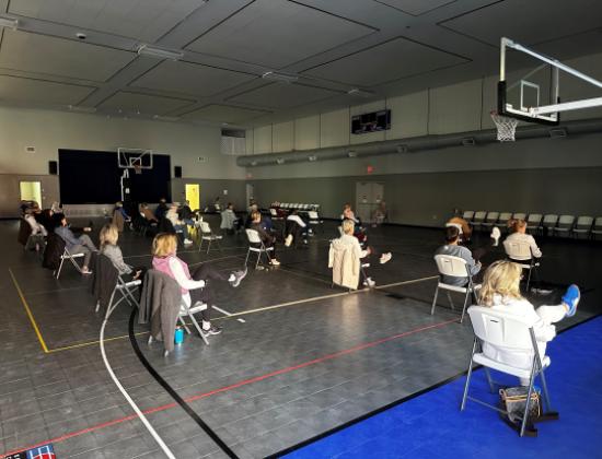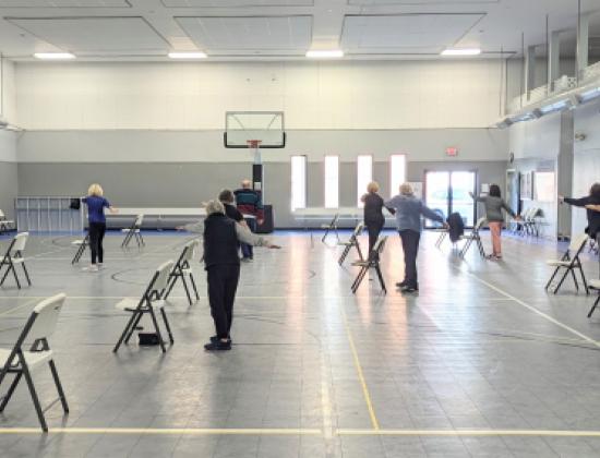 - This class includes exercises with weights, bands with movement in and out of a chair, and yoga stretching at the end.